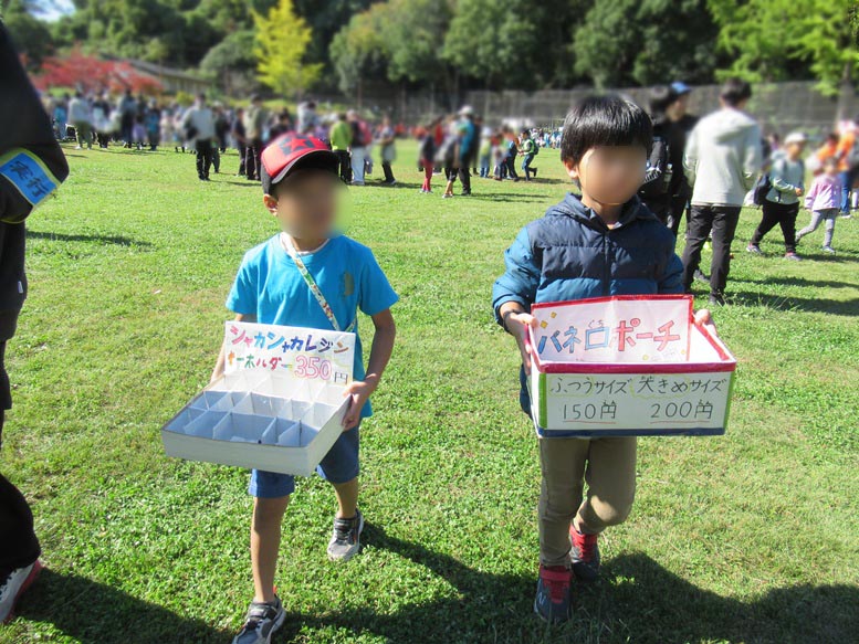 自分達で作成したデザート型キーホルダー、高学年が作ったポーチ・レジンキーホルダーを売り歩きました。